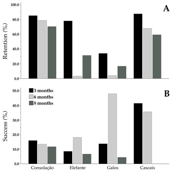The green gravel retention index and success index (both expressed in percentages) are depicted in Figure 6. Regarding retention (Figure 6A), final levels after an 8-month period were consistently lower than those observed at the initial 3-month monitoring period. Consolação began with 85.3% retention, gradually decreasing to our peak final retention rate of 70.5%. Cascais initially exhibited the highest retention rate at 87.8% but concluded the monitoring period with 59.4% retention. Both Berlengas sites experienced sharp declines in retention around the 6-month period, with Elefante dropping from an initial 78.1% to 31.4%, and Galos decreasing from 34.1% to 16.7%.