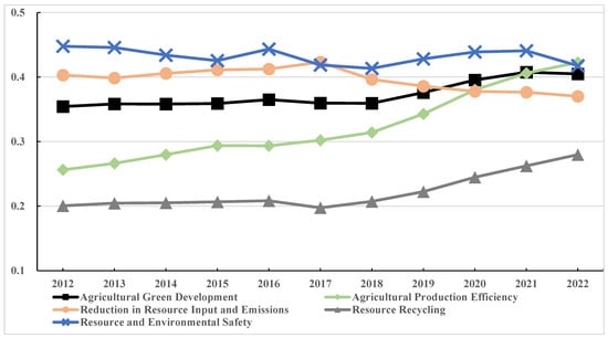 Changes in agricultural green development and its second-level indicators. Note: The figure shows the agricultural green development index for China’s 30 provinces from 2012 to 2022. The square-shaped line represents the overall level of agricultural green development. The diamond-shaped line represents the dimension of agricultural production efficiency. The circular-shaped line represents the dimension of reduction in resource input and emissions. The triangular-shaped line represents the dimension of resource recycling. The cross-shaped line represents the dimension of resource and environmental safety.