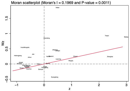 Scatter plot of local Moran’s I index for agricultural green development in 2016. Note: The figure exhibits the scatter plot of the local Moran’s I index for agricultural green development for China’s 30 provinces in 2016. The first quadrant represents “high–high” agglomeration, the second quadrant represents “low–high” agglomeration, the third quadrant represents “low–low” agglomeration, and the fourth quadrant represents “high–low” agglomeration.