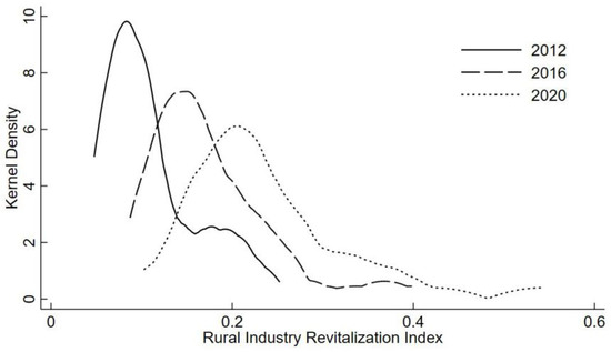 Rural industry revitalization’s index kernel density curve.