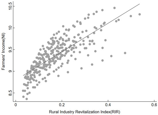 As observed in the two-dimensional scatter plot of the RIR level and the income level of farmers in Figure 2, as the RIR level improves, the income level of farmers in the region gradually increases. This clearly reveals a positive correlation between the RIR level and rural income; that is, RIR promotes the growth of farmers’ incomes. Table 2 presents the descriptive statistical results.