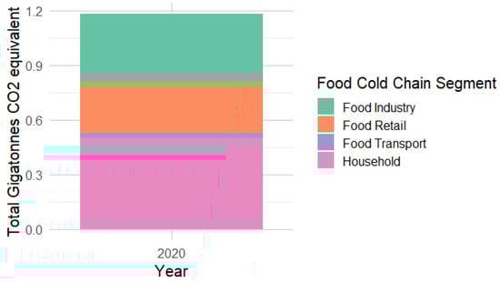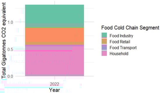 Our findings align well with the distribution of global refrigeration sector emissions reported by the IIR and other studies, such as Dong et al. (2021) [18]. The proportional distribution of emissions across the household, food retail, food transport, and food industry segments in our study is consistent with the electricity consumption patterns of the refrigeration sector reported by the IIR. The close alignment with Dong et al.’s estimates further validates our methodology and underscores the reliability of our results.