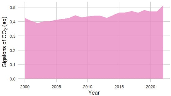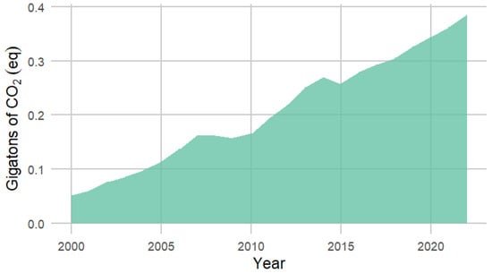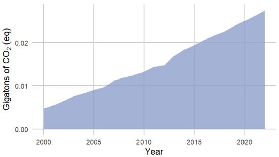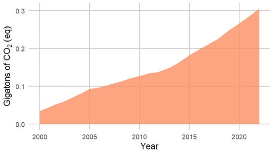 The F-gas emission data used in this calculation, DE, were sourced from FAO [8], together with “food shares” applied to F-gas emissions according to [8]. These activity data inherently pertain to the food sector, excluding F-gas emissions from other sectors such as the pharmaceutical sector. The F-gas emissions at each stage of the agrifood chain are readily available from FAOSTAT in the “Pre and post agricultural production” domain (https://www.fao.org/faostat/en/#data/GPP, accessed on 21 October 2024).