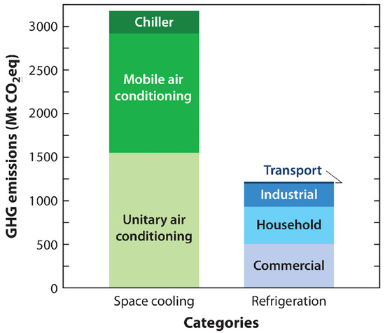 - Dong, Y.; Coleman, M.; Miller, S.A. Greenhouse Gas Emissions from Air Conditioning and Refrigeration Service Expansion in Developing Countries. Annu. Rev. Environ. Resour. 2021, 46, 59–83. [Google Scholar] [CrossRef]