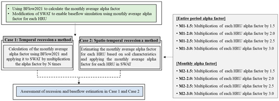 Moreover, since baseflow delivers considerable loads of pollutants to the stream, in-depth research on baseflow and its associated pollutant loads is essential for sustainable water quality management in rivers [15,16]. Thus, baseflow estimation is a crucial component in water cycle analysis, contributing to both quantity and quality, and its variations and quantities over time must be assessed with proper goals [17,18]. For accessibility and convenience in estimating baseflow, various software programs like RECESS [19], RORA [20], BFlow [21], HYSEP [22], and WHAT [23] have been developed and used for various baseflow studies. Moreover, among watershed models, the SWAT has been widely assessed for its applicability across various watersheds, with various studies focusing on baseflow analysis [24,25]. Arnold and Allen [21] proposed calculating the alpha factor related to the recession by using long-term streamflow data in BFlow and then applying it to the SWAT groundwater module. Lee et al. [26] and Lee et al. [27] demonstrated the effectiveness of applying the alpha factor in SWAT, showing more accurate baseflow simulation results when SWAT was calibrated for recession periods using this factor. Moreover, Lee [28] proposed a methodology to apply a monthly alpha factor in SWAT to account for seasonal effects on baseflow regimes and demonstrated its validity. However, regarding the temporal variation of the alpha factor and its impact on streamflow and baseflow simulation in SWAT, the influence of spatial environmental heterogeneity within subbasins on the alpha factor and recession simulation also needs to be evaluated. Although SWAT is already designed to assign specific values for each hydrologic response unit (HRU), a method to calculate alpha factor values for each HRU considering spatial variations has not yet been developed. In other words, previous studies evaluated baseflow by applying a specific alpha factor to each HRU without considering temporal and spatial variations. Therefore, a study that applies the alpha factor in SWAT while considering both spatial and temporal variations is necessary to enhance the understanding of its impact on recession and baseflow. The objectives of this research are to suggest a strategy for assigning monthly alpha factors to each HRU, taking into account the spatial and temporal variations in recession characteristics, and to evaluate the effectiveness of this approach in improving the prediction of recession and baseflow. Figure 1 illustrates the procedure followed in this study. As shown in Figure 1, Case 1 evaluates recession and baseflow predictions in SWAT by applying the monthly average alpha factor, considering the monthly recession characteristics. Case 2, on the other hand, integrates the spatiotemporal characteristics of recession in SWAT. This involves prioritizing variables that influence the alpha factor, assigning difference values, and calculating the alpha factor for each HRU. After applying the calculated spatiotemporal alpha factors to each HRU in SWAT, predictions for recession and baseflow were presented.