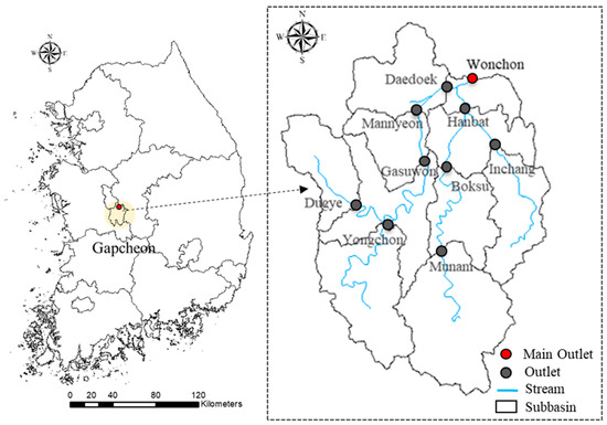 Locations of streamflow observation stations in the Gapcheon watershed.