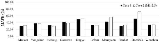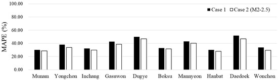 Among the M1s that applied the average long-term alpha factor for each HRU, M1–2.5, which is the result of multiplying the optimal value by 2.5, showed better predictive performance. Although its overall prediction accuracy was lower compared to Case 1 in terms of comprehensive evaluation metrics, this indicates that Case 2 (M1–2.5) has a prediction trend more similar to the observed recession than other M1s. Moreover, when comparing the results from Case 1 (baseline) with M1–2.5, it was evaluated that there was no improvement at multiple stations, and the overall NSE and MAPE predictability decreased (Table 5, Figure 4). In Figure 4, MAPE provides a clear and intuitive measure of the model’s prediction accuracy by expressing errors as a percentage. This makes it easier to understand the relative size of the prediction errors, regardless of the scale of the data. Unlike PBIAS, which can be sensitive to the sign and magnitude of the errors, MAPE focuses on absolute errors, offering a balanced view of model performance across different datasets. In other words, MAPE was indicated to the overall prediction accuracy without being overly affected by individual overestimations or underestimations. Additionally, the NSE values generally worsened across study watersheds (Dugye, Yongchon, Boksu, Mannyeon, Hanbat, Daedoek, and Wonchon), with the exception of Munam and Inchang, which remained unchanged. While the PBIAS values ideally should decrease as they approach zero, the outcomes were different: the PBIAS values for most watersheds, including Munam, Inchang, Gasuwon, Dugye, Boksu, Mannyeon, Daedoek, and Wonchon, actually decreased, indicating an improvement, whereas only Yongchon and Hanbat showed an increase. The lack of improvement in MAPE results and the significant estimation uncertainty are presumed to be due to applying a uniform alpha factor from the M1s distribution. In this context, MAPE, which is Mean Absolute Percentage Error, measures the accuracy of the model by quantifying how closely the predicted values align with the observed data. A lack of improvement in MAPE indicates that the model’s predictions are still showing considerable deviation from the actual values, suggesting that the use of a uniform alpha factor in the entire period may not be suitable for effectively predicting the variations within the recession. In other words, the methodology adopted from M1s is unsuitable for the intended simulations.