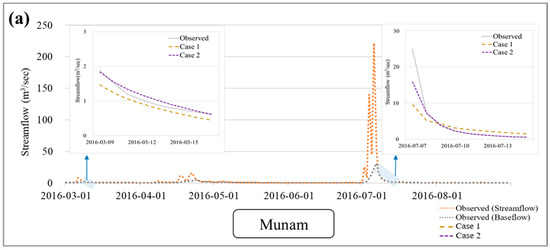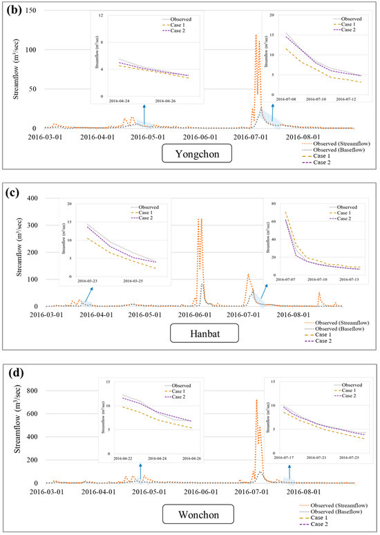 Before evaluating the baseflow prediction of Case 1 and Case 2, it is necessary to assess whether the model accurately simulates streamflow results. Table 4 presents the calibration results for the streamflow estimated using Case 1 in this study. For the SWAT calibration assessment by Moriasi et al. [43], the NSE was evaluated as ‘satisfactory’ (NSE > 0.5). Moreover, as the IOA approaches 1, it indicates a higher level of agreement between the model predictions and the observed data. The IOA results also indicate high streamflow simulation predictions for the nine subbasins and the one watershed. The remaining evaluation metrics, R2 and PBIAS, also indicate that the model calibration was generally well performed. Specifically, for the Munam, Inchang, and Mannyeon watersheds, positive PBIAS values (9.51%, 9.66%, and 7.25%, respectively) indicate that the model shows a slight underestimation of the observed values. On the other hand, the Gasuwon watershed has a negative PBIAS of −8.36%, indicating that the model slightly overestimates the observed values. These PBIAS values, along with the R2 values, support the conclusion that the model calibration achieved a reasonable level of accuracy. Moreover, Table 4 indicates that the provided explanation emphasizes the importance of using multiple evaluation metrics to assess model performance comprehensively. In the case of Dugye, while the NSE value of 0.73 indicates satisfactory calibration and is the highest among the ten study watersheds, and the IOA of 0.93 suggests a strong agreement between model predictions and observed data, these metrics alone do not provide the complete view of model accuracy. The high PBIAS of 35.26% reveals a significant bias in the model’s predictions, indicating that despite the satisfactory NSE and IOA values, the model either consistently overestimates or underestimates the observed values. This discrepancy highlights that even when metrics like NSE and IOA suggest good performance, a PBIAS can uncover areas where the model’s accuracy is lacking, reinforcing the need to use multiple metrics for a thorough evaluation of model performance.