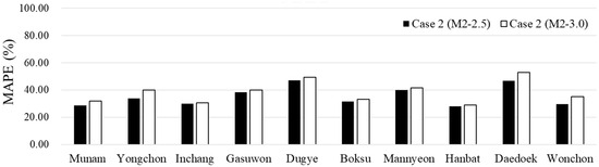 An additional comparative analysis of the recession curve was conducted for M2–2.5 and M2–3.0 in Case 2. The only difference between M2–2.5 and M2–3.0 is that the maximum range for M2–3.0 was set to 3. As shown in Table 7 and Figure 7, the improvement rate of MAPE in M2–3.0 was lower than in M2–2.5. Moreover, M2–2.5 presented results that showed a decrease in model predictability and increased uncertainty from the upstream to the downstream locations across different performance criteria. As a result, at the main outlet, Wonchon, M2–3.0 indicates a significant difference compared to M2–2.5. This means that the differences between M2–2.5 and M2–3.0 at Wonchon indicate that M2–3.0 results in a decline in performance across multiple metrics, including increased bias and error. These differences suggest that M2–2.5 provides more accurate predictions and a better fit for the observed recession in Wonchon. Therefore, M2–2.5 appears to be the preferable method for this watershed when the goal is to minimize overestimation and ensure more reliable recession predictions.