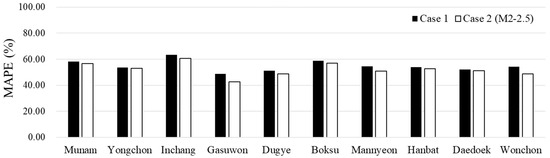 After evaluating the recession simulations from M1s to M2s in Case 2 compared to Case 1, the baseflow was evaluated for the optimal approach in Case 2 (M2–2.5) (Table 8). Similar to the trends observed in the simulations, the results of Case 2 (M2–2.5) showed improvement compared to Case 1 in baseflow results. In particular, in Case 2 (M2–2.5), there was a decrease in MAPE error rates, resulting in better results (Figure 8). Moreover, PBIAS exhibited trends similar to those observed in the data. The comprehensive results of recession and baseflow simulations indicate that when applying the monthly average alpha factor by HRU in SWAT, ensuring the reliability of model results requires an average application of more than 2.5 times the baseline value. This study improved the simulation analysis of baseflows at specific stations by differentially applying HRU-specific alpha factors rather than a uniform application across all HRUs.