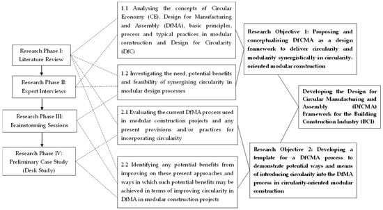 For this purpose, a comprehensive literature review was conducted to conceptualise DfCMA in the BCI. This endeavour was followed by interviews with experts in CE and modular construction, brainstorming sessions and the preliminary phase of a case study to identify possible ways and means of introducing or injecting more circularity into a typical DfMA process, as presented below under the following sections and sub-sections.