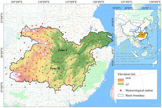 The MLRYRB is located at 103°30′–122°30′ E and 23°45′–34°15′ N (Figure 1). The area of the MLRYRB is approximately 915,000 km2. The study area has a typical subtropical monsoon climate and is divided into the northern subtropical (Zone I) and central subtropical climate (Zone II) zones. The terrain gradually decreases from northwest to southeast, with an average elevation of 377.5 m. The study area has mild precipitation in the winter and abundant precipitation in the summer. The annual average precipitation is 1370.8 mm, and the annual average temperature is 16.0 °C. The summer monsoon rainfall and the influence of cold air from the north result in a long plum rain season in June and July. Subsequently, a summer drought occurs in response to subtropical high pressure in the western Pacific Ocean [41].