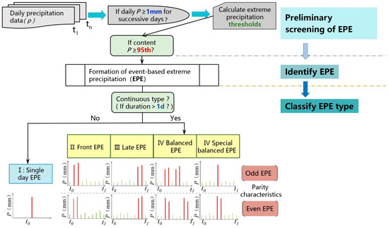 Variations in peak locations during EPEs and peak precipitation amounts lead to varying disastrous effects of their ephemeral processes [18,20]. This study drew on existing studies to define and categorize EPEs (Figure 2). First, continuous effective precipitation was extracted depending on whether the daily precipitation was constantly no less than 1 mm, and then effective precipitation events were further extracted by determining whether they had extreme precipitation days. Finally, each EPE was categorized based on the positional attributes of the extreme precipitation days in the event, which mainly consisted of the following four types: a front EPE, a late EPE, a balanced EPE, and a single-day EPE (Table 2).