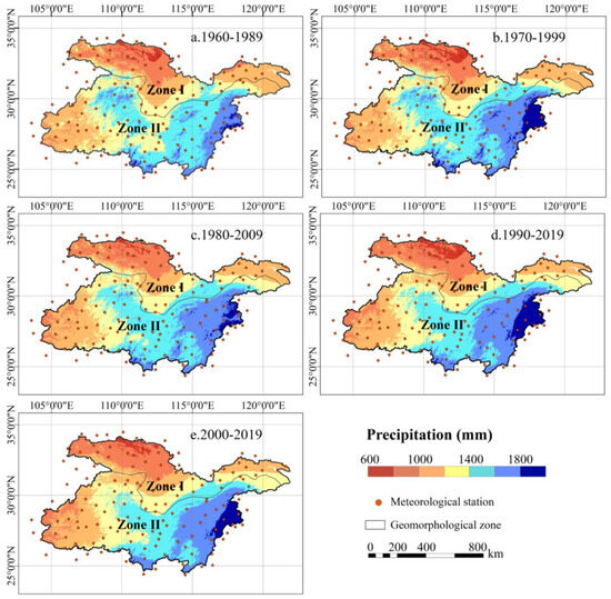 Spatial distribution of precipitation in different climate zones during the 1960–2019 period in the mid–lower reaches of the Yangtze River Basin.