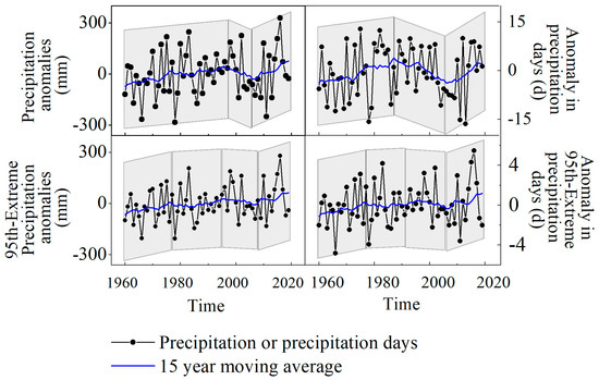 Seven extreme precipitation indices recommended by the Expert Team on Climate Change Detection and Indicators were selected for this study: PRCPTOT, R99p, R95p, Rday, R95day, SDII, and SDIIq95 (Table 1) [42,43].