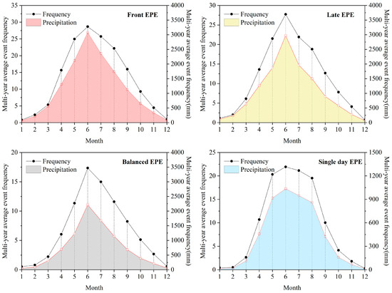 Cumulative frequency and monthly precipitation for different extreme precipitation event (EPE) types during the 1960–2019 period.
