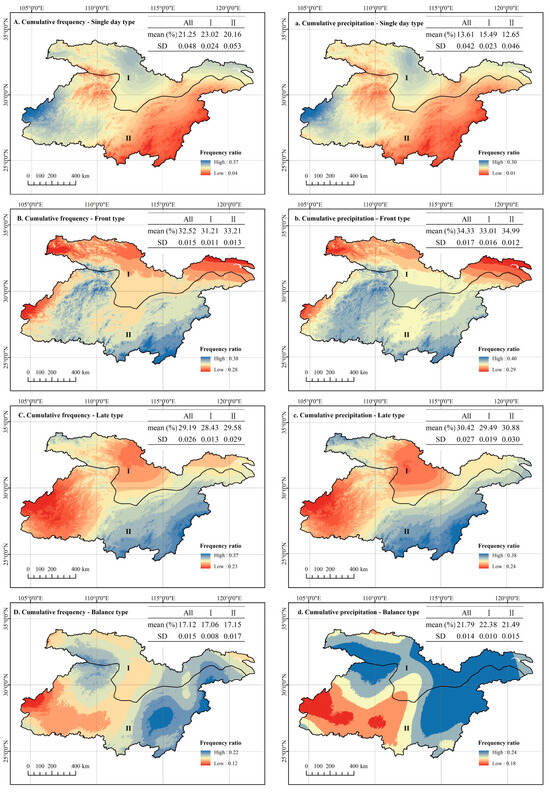 The spatial distribution of the cumulative precipitation and frequency (Figure 7) showed that the multi-year frequency and precipitation quantity of EPEs in the basin almost corresponded spatially. Single-day EPEs varied spatially from east to west, with a low value being observed in the eastern part of the basin. Late EPEs decreased gradually from southeast to northwest. In terms of differences in spatial dispersion, the Cv values were less than 0.07 and the entire basin exhibited relatively low spatial variations, indicating that the MLRYRB is dominated by variations in the four EPE types.