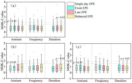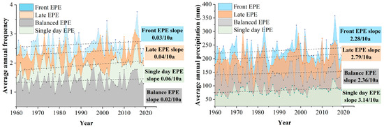 The precipitation amount and frequency of single-day EPEs accounted for only 13% and 21% of the EPEs, respectively, while the multi-day continuous EPEs (front EPE, late EPE, and balanced EPE) containing PSP accounted for 87% and 79%, respectively (Figure 6a,b). Front EPEs and late EPEs are the predominant EPE types in the MLRYRB, with both accounting for more than 60% of EPEs in the past 60 years.
