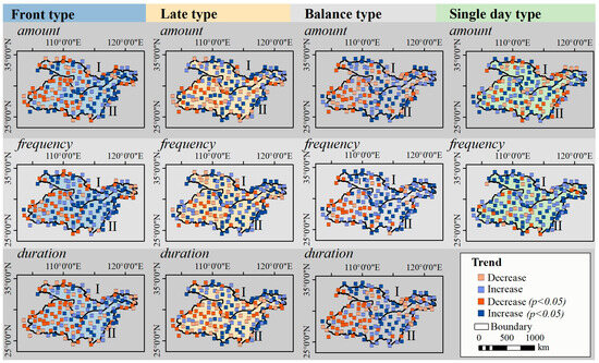 The frequency of the four types of EPEs in the MLRYRB exhibited a certain degree of variation in the last 60 years (Figure 8). The frequency of multi-day continuous EPEs was in the order of late EPEs > front EPEs > balanced EPEs. Although the frequency and quantity of single-day EPEs were low, single-day EPEs had the highest increase of nearly 60%. Spatial variation trends (Figure 9) revealed that the precipitation, frequency, and duration of front, late, and balanced EPEs in the southwest of the MLRYRB, including the Guizhou Plateau and Sichuan Basin, exhibited a downward trend. In contrast, an upward trend was shown in the southeast part of the MLRYRB.