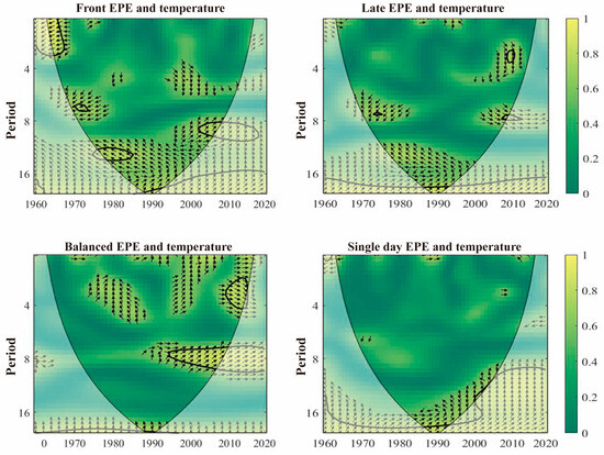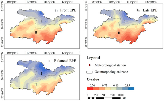 The long-term mean C-value for the three multi-day continuous EPE types ranged from 0.65 to 0.9 (Figure 11). The concentration range of the late EPEs was the lowest, indicating a greater contribution of PSP to late EPEs, followed by front EPEs. Both late and front EPEs showed considerable differences between the northern and southern area, and their spatial distribution was consistent with climatic regionalization. The concentration range of the balanced EPEs was relatively small, and the spatial distribution characteristics were consistent with that of China’s isoprecipitation line, which decreased from the southeast to the northwest.