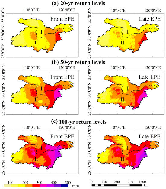 The two crucial and predominant EPE types in the MLRYRB were front and late EPEs because of their higher total amount and frequency of 65% and 62%, respectively. Therefore, the regression levels at 20, 50, and 100 years were set to predict the front and late EPEs (Figure 12). The regional averages of the 100-year prediction levels for front and late EPEs were 250 and 230 mm, respectively. From the west to the east, the front EPEs usually display higher precipitation than late EPEs, both of them indicating a significant increase in the horizontal direction.