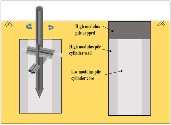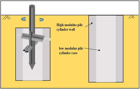 The cement slurry is mixed with the soil by external spraying and internal mixing. This is achieved by jetting the slurry horizontally at high pressure through the nozzle at the end of the mixing rod and by rotating the drill pipe and lifting it at low speed. The mixing rod is used to stir the return slurry and the soil, thus forming a drilling and spraying churning pile with a high-strength cylindrical wall and a low-strength cylindrical core. The formation of the pile is illustrated in Figure 6.