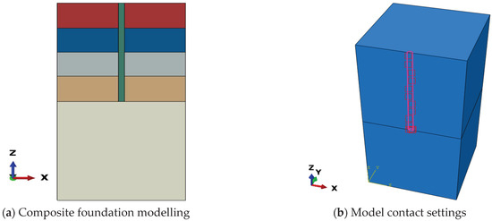 A composite foundation, illustrated in Figure 8a, is constructed whereby the soil is represented by the Moore–Cullen model and the cemented soil (pile) is modelled using the linear elasticity model. In the process of modelling, the diameter of the soil body is typically set to be 20 times larger than that of the pile body, while the distance from the end of the pile to the bottom of the soil body is generally larger than 10 times the diameter of the pile body. This approach circumvents the issue of non-convergence of the calculated results and the boundary effect that can arise during numerical simulation.