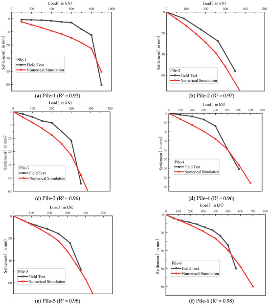 Figure 9 illustrates a comparison of the load settlement behavior observed in field tests and that predicted by numerical studies. The use of numerical simulation allows for the precise measurement of load values, whereas the actual load of the field loading test is subject to disturbance from factors such as pile head flatness. It should be noted that the load values for each level of the two curves are not identical; however, this does not impact the analysis and comparison of the data. The degree of fit (R2) of the six sets of models to the measured data in the field was 0.93, 0.97, 0.96, 0.96, 0.98, and 0.98, respectively, indicating that the models are reliable. It is observed that the simulation method of the single pile static load test adopted in this paper can accurately reflect the results of the field test. Furthermore, it can be used for further analysis of single pile-bearing characteristics.