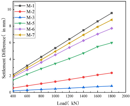 It can be observed that with an increase in load, the settlement difference gradually increases. As the discrepancy between the inner and outer moduli of the pile increases, the settlement difference is observed to increase, reaching a maximum settlement difference of over 9 mm.