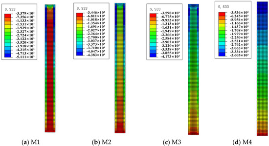 Figure 13 illustrates the stress cloud diagrams of the pile body at the ultimate load for a variety of pile types. It can be observed that the pile body stress of the variable-modulus pile is concentrated on the pile’s outer side. The values displayed in the graph indicate the magnitude of the vertical stress in kPa, with a negative sign denoting the direction of the stress. A reduction in the modulus of the pile’s core results in an increased stress borne by the pile’s outer side, accompanied by a more pronounced stress concentration phenomenon. As the modulus of the pile core increases, the load-bearing ratio of the core also increases in accordance with the aforementioned relationship. However, the depth of the stress-concentration section on the pile’s outer side decreases, thereby making the stress-concentration phenomenon less obvious. The stress of the pile body of the uniform modulus pile (M4) is concentrated at the top of the pile, with the load distributed uniformly across the top.