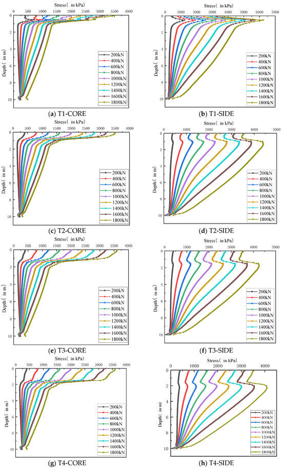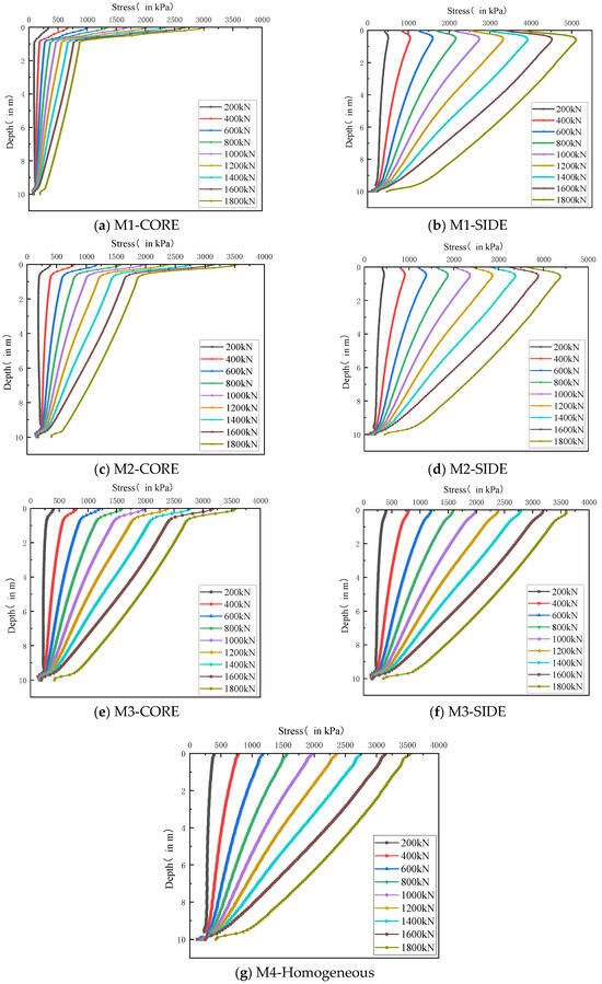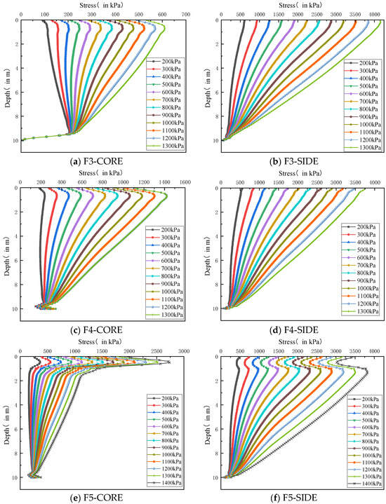 In the load range of 200 kPa to 500 kPa, the stresses at the pile core demonstrate a gradual increase with depth. This is due to the fact that when the load is relatively low, the stress concentration on the pile’s outer side is not readily apparent. At this point, the entire pile body undergoes integral deformation, with the pile core’s bearing capacity being fully utilized. Consequently, the stress within the pile core increases with depth.