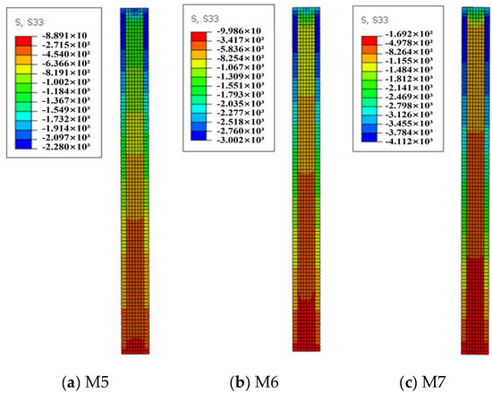 Figure 15 illustrates the extracted vertical stress clouds of the profiles of the pile’s outer side when damaged from M5 to M7. The values displayed in the graph indicate the magnitude of the vertical stress in kilopascals (kPa), with a negative sign denoting the direction of the stress. Upon reaching the ultimate bearing capacity of the material, the outer side of the pile experiences a failure in advance of the ultimate load, resulting in damage to the pile body. This suggests that if the pile’s outer side is not capable of withstanding its ultimate load, early damage will occur and capping will be required to protect the pile head.