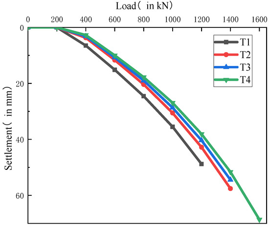 It can be observed that each curve exhibits a discernible ultimate load and scale limit. Furthermore, it can be discerned that the characteristic value of composite foundation-bearing capacity diminishes in a gradual manner with the increase in pile spacing. The characteristic values of composite foundation bearing capacity are 700 kPa, 450 kPa, 350 kPa, and 300 kPa, respectively.