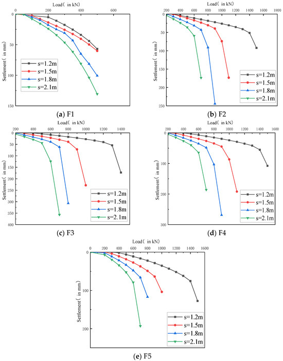 Figure 19b illustrates the load–settlement curve of F2. It is evident that an increase in pile diameter and strength will lead to a notable enhancement in the composite foundation’s bearing capacity. Additionally, the impact of pile spacing on the strength behavior of the composite foundation is pronounced when the spacing is minimal.