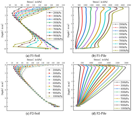 The distribution of stress in piles of soil under different spacing conditions exhibits a similar pattern. For the purposes of this analysis, the working condition of a 1.2 m pile spacing has been selected. Figure 20a illustrates the vertical stress distribution of the soil in proximity to the pile in F1. As the load is increased, the stress of the soil on the side of the pile reaches a maximum at the point of contact with the pressure plate, after which it decreases gradually. A minimum stress value is recorded at a distance between 1 and 2 m from the top of the pile.