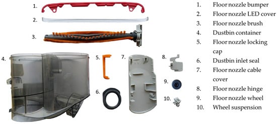 We chose to study a high-end vacuum cleaner as the European Commission is developing new eco-design regulations for this product category [25,26]. Also, the complexity of this product will give valuable insights into the printability of consumer products and the issues that might be encountered. From this vacuum cleaner, we chose the following ten parts: the bumper, LED cover, wheel suspension frame, brush locking cap, back cable cover, hinge, wheel and brush of the floor nozzle, and the container and inlet seal of the dustbin. These parts were selected to present a variety of design requirements and part complexity. Generally, all parts could be fully disassembled to give a fair overview of the capabilities and limitations of additive manufacturing rather than of reparability. However, one submodule was selected to explore the challenges that these submodules might pose for the application of additive manufacturing.