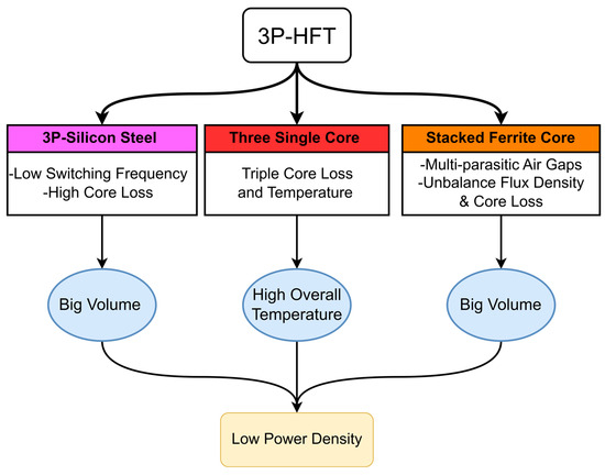 Numerous attempts to design HFTs have been documented in the literature, but the majority of these studies focused only on the design of 1P-HFTs for 1P-BIDCs as in [16,17,18,19,20,21] and were extended even further for use in 3P-BIDCs. As in [11], three discrete ferrite cores were considered in a 3P-BIDC for use in charging stations. On the other hand, three toroidal nanocrystalline cores were examined in [22] as an isolation and filtering network for use in a multiport 3P-BIDC. Similar to this, ref. [23] used three single-core transformers with two windings to produce the inductance to operate a 3P-BIDC. However, each transformer had losses and increased the overall temperature. Moreover, the number of components in the structure was increased, which may have reduced the overall power density [23].