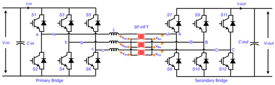 Figure 2 shows the circuit diagram of a 3P-BIDC operating in six-stage switching mode with a duty cycle of 50% for each 3P branch. The phase branches have a phase shift of 120° from each other at the switching frequency. The 3P-BIDC has two active voltage-source bridges connected via an HFT. The primary-side converter inverts the input DC voltage into a high-frequency AC voltage via three half bridges, which is then applied to the transformer. The secondary-side converter rectifies the voltage at the secondary terminals of the transformer [6]. The converter specifications used in this article are shown in Table 1.