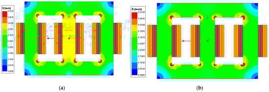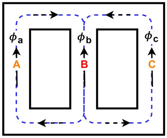 In considering the equivalent magnetic reluctance of each core limb, Limb B had a shorter magnetic MPL than Limbs A and C, and according to the 3P-cores in [37], the difference in MPL among the core limbs was about 28.3%. The and values were inversely proportional to the MPL, as shown in Equations (2) and (3), respectively [35]: