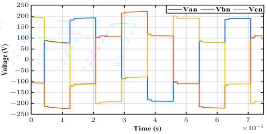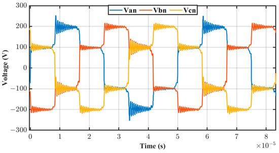 Figure 4 shows the simulated AC phase voltages of the 3P-BIDC based on the converter specifications in Table 1. The maximum AC phase voltage in the 3P-BIDC was equal to , and according to the converter specifications, the peak phase voltage should be 200 V. However, the maximum AC voltage could not reach 200 V in each phase due to the different values of among the core limbs. The voltage in phase B was greater than 200 V due to the higher in Limb B of the 3P-HFT.