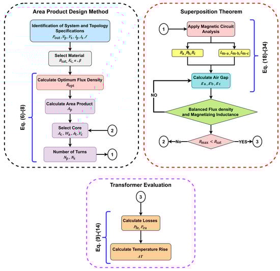 Figure 5 shows the flowchart of the design methodology. The area product design method was used for the core and winding design as it is considered an effective HFT design method for application in power electronic converters. The initial stage of the HFT design involved choosing an appropriate magnetic material.
