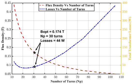 Figure 6 shows the design points of the proposed 3P-HFT. The dotted red curve represents the variation of flux density with the number of windings turns at a fixed core cross-sectional area (), an operating frequency (), and applied RMS voltage (). The dotted blue curve represents the change of the total transformer loss with the number of turns. The copper loss becomes the dominant transformer loss when the number of winding turns is more than 42.