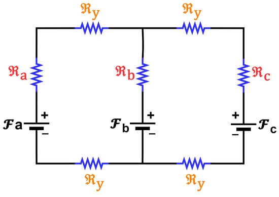 Figure 7 shows the magnetic circuit of a 3P-transformer with three MMFs, which arises from the current flow in the primary winding of each phase. Since the 3P-core has multiple MMF sources, the superposition theorem was proposed as a magnetic circuit analysis technique, which could be used to determine the flux, flux density, and magnetizing inductance of each magnetic core limb during the design process.