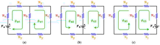 The equivalent reluctance was calculated with one MMF being activated in the core limb, while the other two MMFs were considered to be zero. This was performed for Phases A, B, and C, as follows: