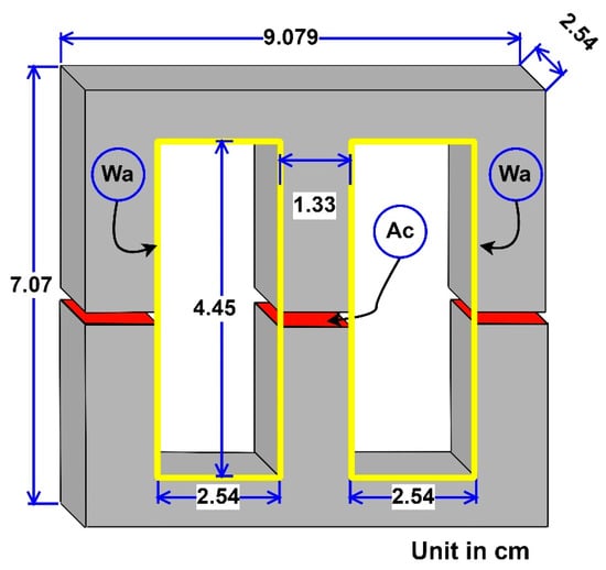 The optimal flux density () was calculated by considering the design specifications and the selected material. Then, the core area product was calculated to select the core and define the core size and dimensions, such as , window area (, and core volume (. The primary number of turns was calculated based on the applied voltage and the while the number of secondary turns ( was calculated based on the transformer’s turn ratio. In order to determine the and in each core limb, the superposition theorem was used for the magnetic circuit analysis when the maximum operating of the transformer was <0.3 T. Then, the air gaps were calculated based on balancing the and , while considering that the final should be <. Finally, the designed transformer was evaluated based on the calculated core loss and copper loss and overall rise in temperature.