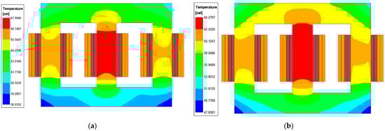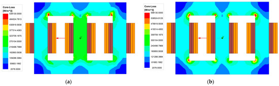 Within the 3P-EE core, one window was shared by two phases. The of the chosen core was 11.303 cm2, and the areas occupied by the primary and secondary windings in each window were 0.0314 30 = 0.942 cm2 and 0.0314 30 = 0.942 cm2, respectively. Therefore, the = (2 0.942 + 2 0.942)/11.303 = 0.34. As demonstrated in the section on the comparison of the results, a lower improved the thermal performance of the 3P-transformer.