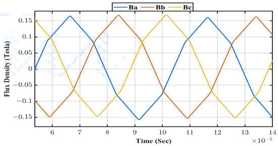 This discrepancy led to notable differences in the peak phase voltages of the three phases of the 3P-BIDC, as shown in Figure 4. However, the selected air gap values effectively balanced the and , reducing the overall by 0.069 T in Limb B. The core loss without the air gap was estimated based on the highest found at Limb B at 0.417 T, while the core loss with the air gap was reduced by approximately 2.66 W, which was associated with a reduction in .