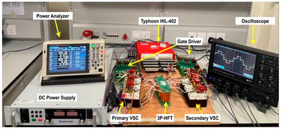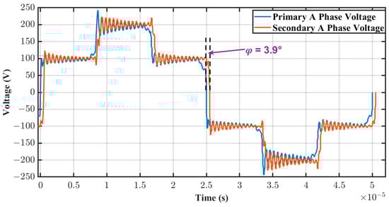 Figure 18 depicts the experimental waveform of the AC terminal phase voltages across the primary and secondary bridges, where the rated power was achieved at φ = 3.9°. The waveform revealed that the primary voltage led the secondary voltage by φ = 3.9°, indicating that power flowed from the primary bridge to the secondary bridge.