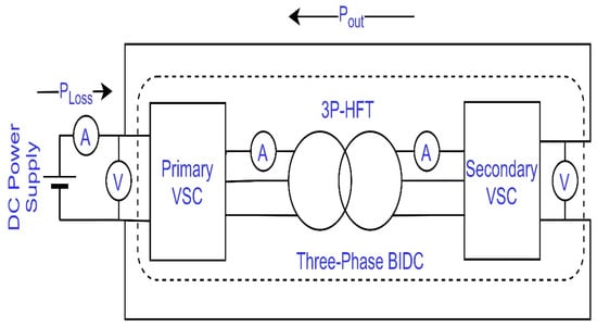 Bidirectional isolated DC-DC converters (BIDCs) or dual active bridges (DABs) are the most promising isolated DC-DC topologies. These converters ensure stable and sustainable power transmission across various energy sources while enabling high power conversion efficiency [5]. Their application as solid-state transformers in all-electric ships and aircraft, as well as in energy storage for electric cars and renewable energy systems, has been the subject of several recent studies [2,6,7,8,9,10]. The two most popular types of BIDC are the single-phase (1P-BIDC) and three-phase (3P-BIDC) models. The advantages of these converters include isolation features, soft switching, and bidirectional power flow. A 3P-BIDC can have smaller input and output filters, a lower root mean square (RMS) current in its transformer, and a higher power density than a 1P-BIDC. Moreover, the 3P-BIDC with its greater efficiency and power density, lower backflow power, and lower switching stresses, is becoming increasingly more popular than the 1P-BIDC [11,12,13,14].
