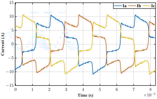 Figure 20 shows the symmetrical 3P current of the primary side operating at full load. The peak value was 10 A, where this value was achieved according to the leakage inductance inside the 3P-HFT without the use of an external inductor. Moreover, each leg of the 3P-BIDC transferred power equally, according to the phase voltage in Figure 19 and phase current in Figure 20.